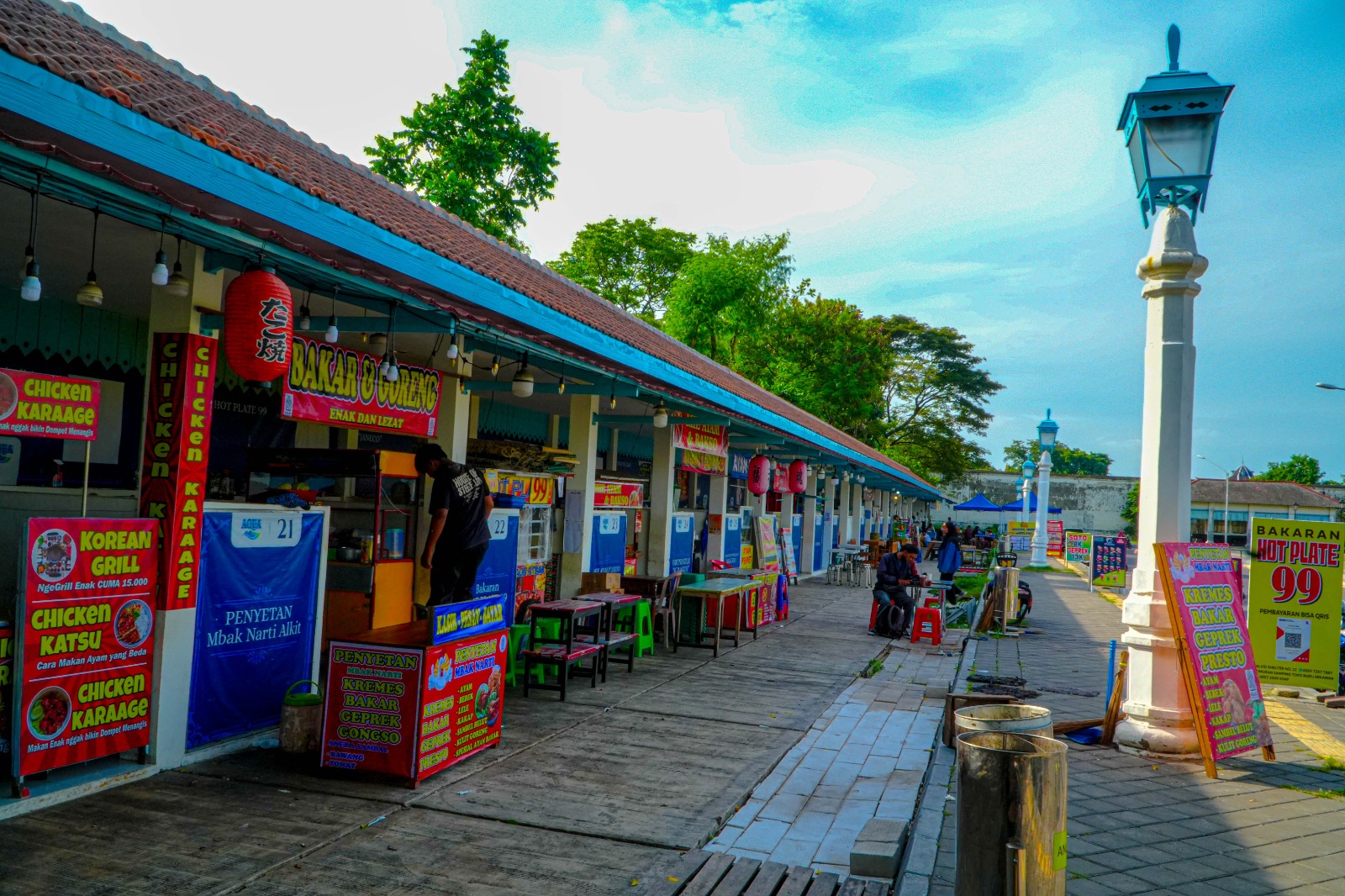 Yang seru, tempat makannya nggak ribet. Mau duduk di bangku plastik atau gelar tikar lesehan? Semua bisa. Sambil nunggu pesanan, banyak yang asyik jepret-jepret foto. Lampion merah bergaya Jepang dan kios warna biru-putih bikin background-nya aesthetic banget buat konten Instagram.