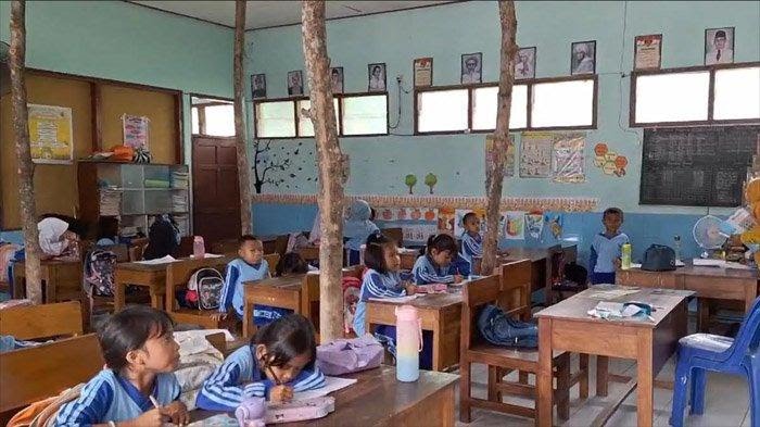 Tiga ruang kelas dalam kondisi memprihatinkan sejak 2022 dan hanya ditopang tiang kayu sebagai penyangga sementara.