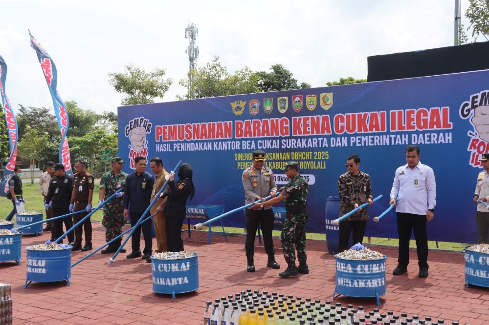 Pemusnahan Barang Kena Cukai Ilegal hasil penindakan Bea Cukai Surakarta dan Pemerintah Daerah, dalam rangka Hari Bea Cukai ke-79 Selasa (21/10/25) pagi. (Foto: Humas Polres Boyolali)