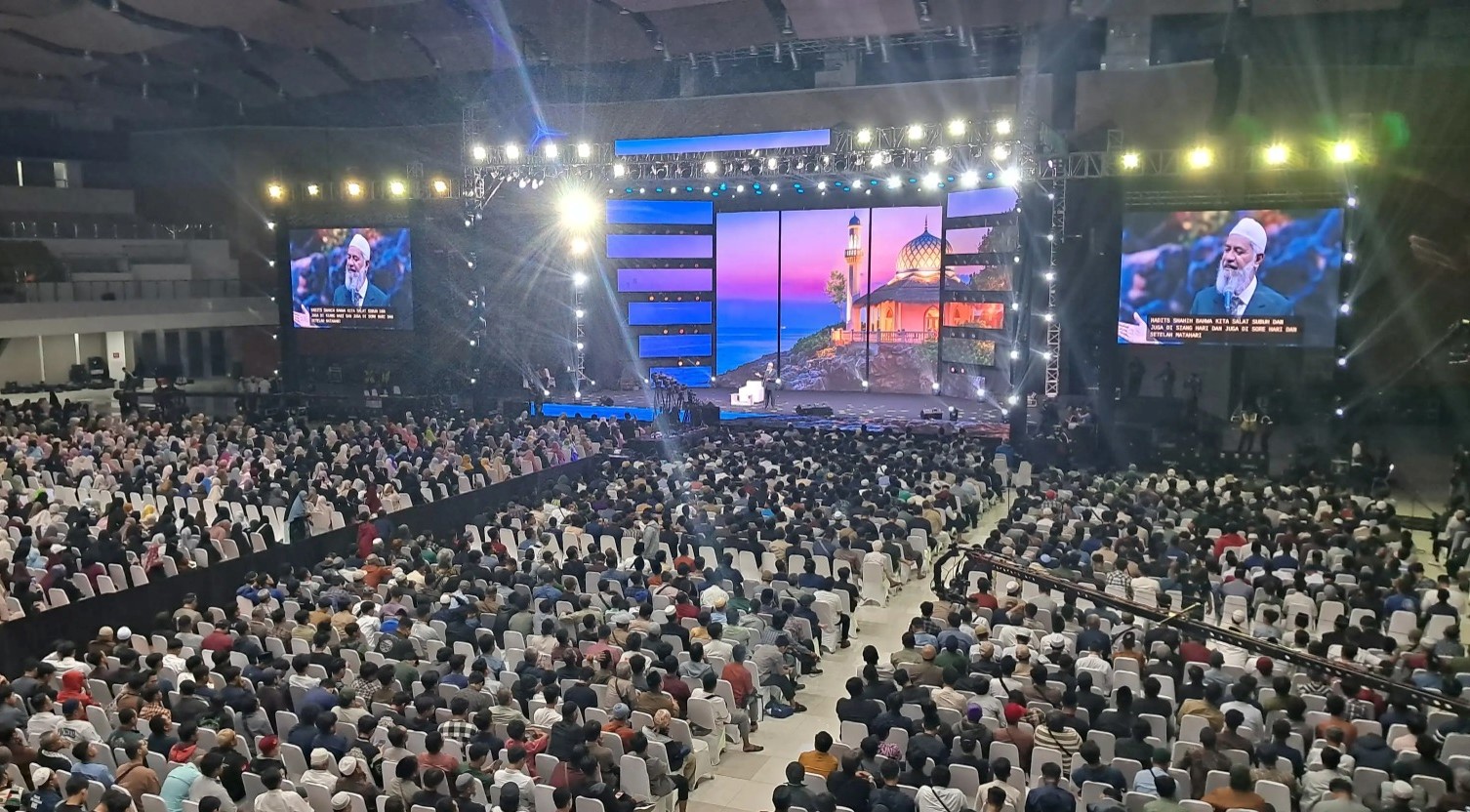 Tepat pukul 20.10 WIB, Dr. Zakir Naik naik ke panggung dan disambut tepuk tangan meriah ribuan hadirin. Dalam ceramah bertema “Pendidikan untuk Dunia dan Akhirat”, penceramah lulusan Fakultas Kedokteran University of Mumbai itu menyampaikan materi dalam Bahasa Inggris.