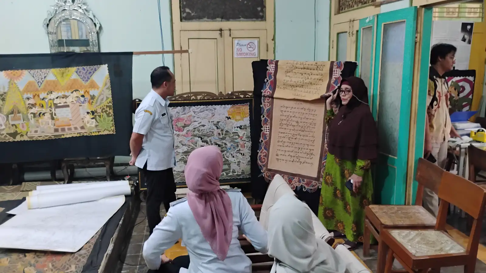 Camat Laweyan Herwin Tri Nugroho Adi (kiri berdiri) dan Wakil Wali Kota Solo Astrid Widayani mendapatkan penjelasan kelas aksara Jawa dari pemilik Batik Mahkota Laweyan, Juliani Prasetyaningrum, di Kampung Wisata Batik Laweyan, Kecamatan Laweyan, Solo, Rabu (2/6/2025). (Foto espos)