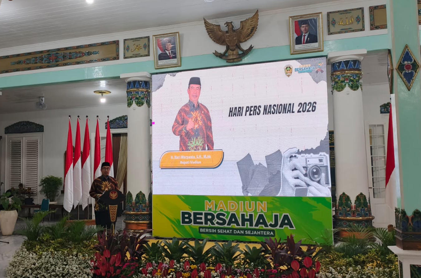 Komitmen tersebut disampaikan Bupati Madiun Hari Wuryanto saat menghadiri peringatan HPN di Pendopo Mudha Graha, Kabupaten Madiun, Senin (9/2/2026) malam.