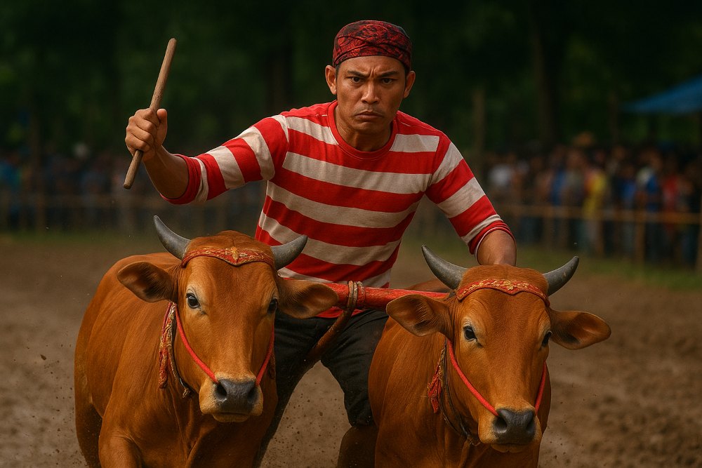 IndonesiaBuzz : Budaya – Debu membumbung tinggi di atas tanah lapang. Sepasang sapi pacu yang mengenakan kaleles perlengkapan kayu untuk menyangga joki melaju kencang, adu cepat melawan pasangan lain. Di atasnya, tukang tongkok (joki) berusaha mengendalikan arah sambil mempertahankan keseimbangan. Sorak sorai penonton yang memenuhi arena menambah semarak perlombaan. Inilah suasana Karapan Sapi, tradisi pacuan sapi khas Madura, Jawa Timur, yang tetap bertahan lintas generasi.