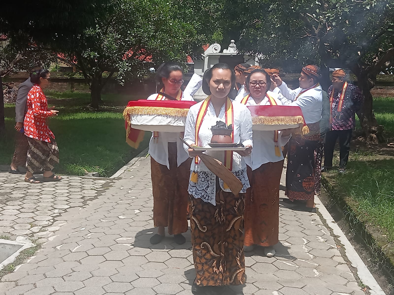 Para utusan dalem Kraton Kasunan Surakarta Hadiningrat, yang dipimpin oleh GKR Alit, berjalan beringiringan dari pendopo menuju pemakaman Amangkurat Agung, mengikuti prosesi ziarah dengan khidmat.