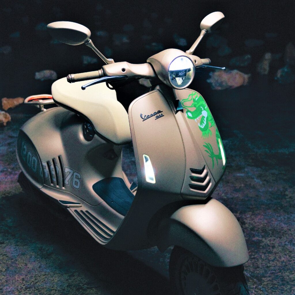 Menariknya, Vespa edisi limited ini didasari dengan warna emas yang dipadukan dengan motif naga tiga dimensi berwarna hijau zamrud. Perpaduan itu tampak kontras namun elegan.