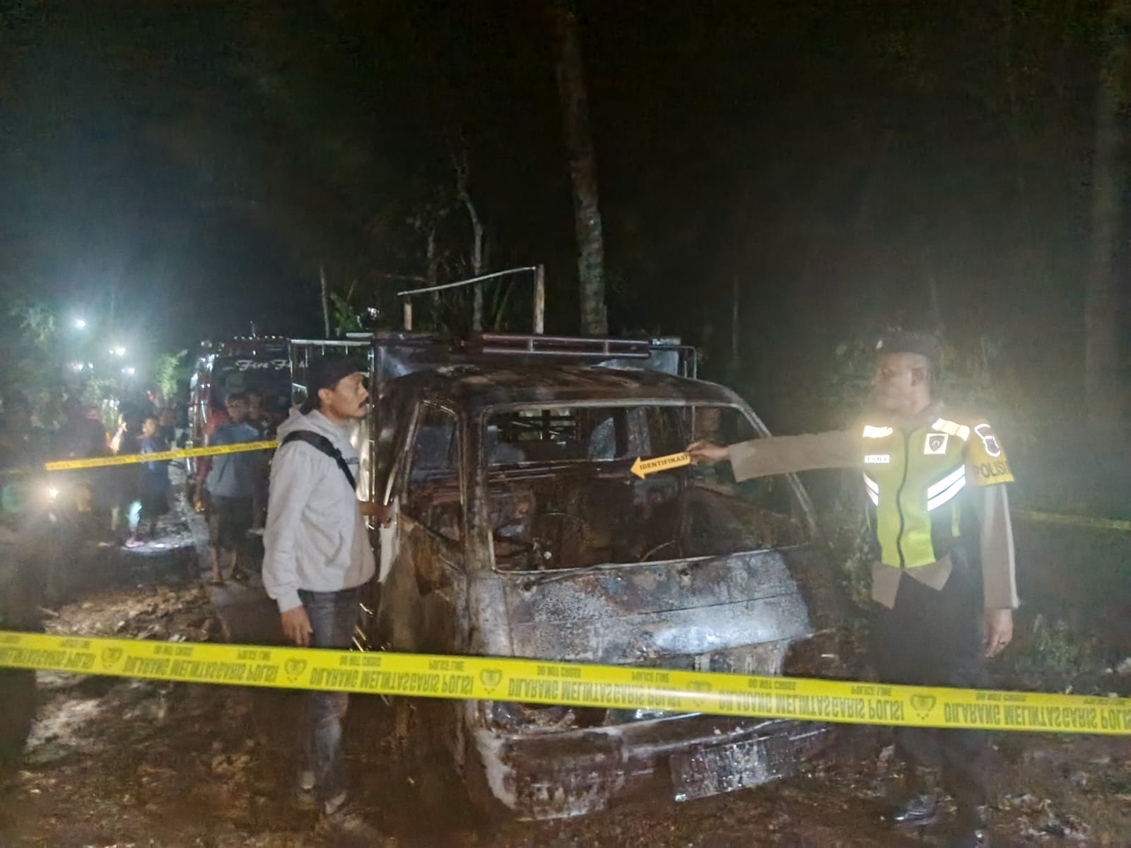 Petugas Polsek Paranggupito , saat olah TKP sebuah mobil pick up terbakar di jalan lingkungan Dusun Ngelo, Desa Gudangharjo, Kecamatan Paranggupito, Kabupaten Wonogiri, Kamis (15/1/26) malam. (foto: Humas Polres Wonogiri)