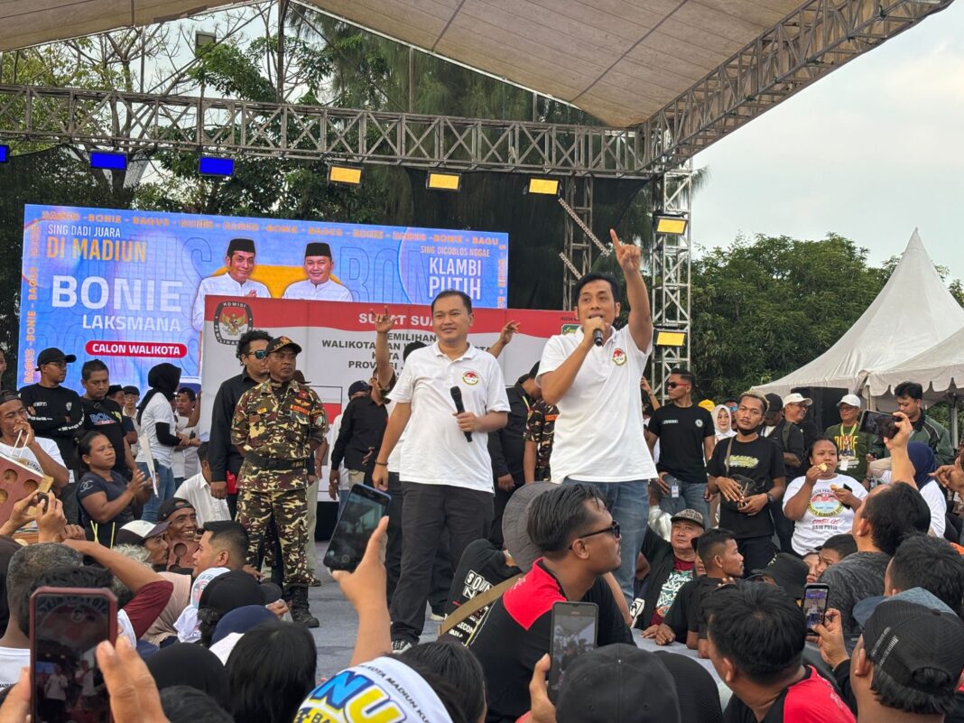 IndonesiaBuzz: Madiun, 8 Oktober 2024 – Pasangan calon Wali Kota dan Wakil Wali Kota Madiun nomor urut 3, Bonie Laksmana dan Bagus Rizki Dinarwan, yang dikenal dengan sebutan “BONUS,” menggelar kampanye terbuka pada Minggu (6/10/2024) sore di Lapangan Rejomulyo, Kecamatan Kartoharjo.
