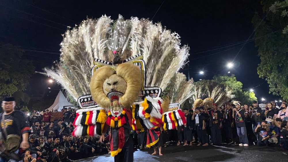 Penampilan seniman Reog Ponorogo memeriahkan gelaran Tadarus Budaya di Alun-alun Merdeka Ngawi, Sabtu (7/3/2026) malam. (Foto: IndonesiaBuzz/Esaputra)
