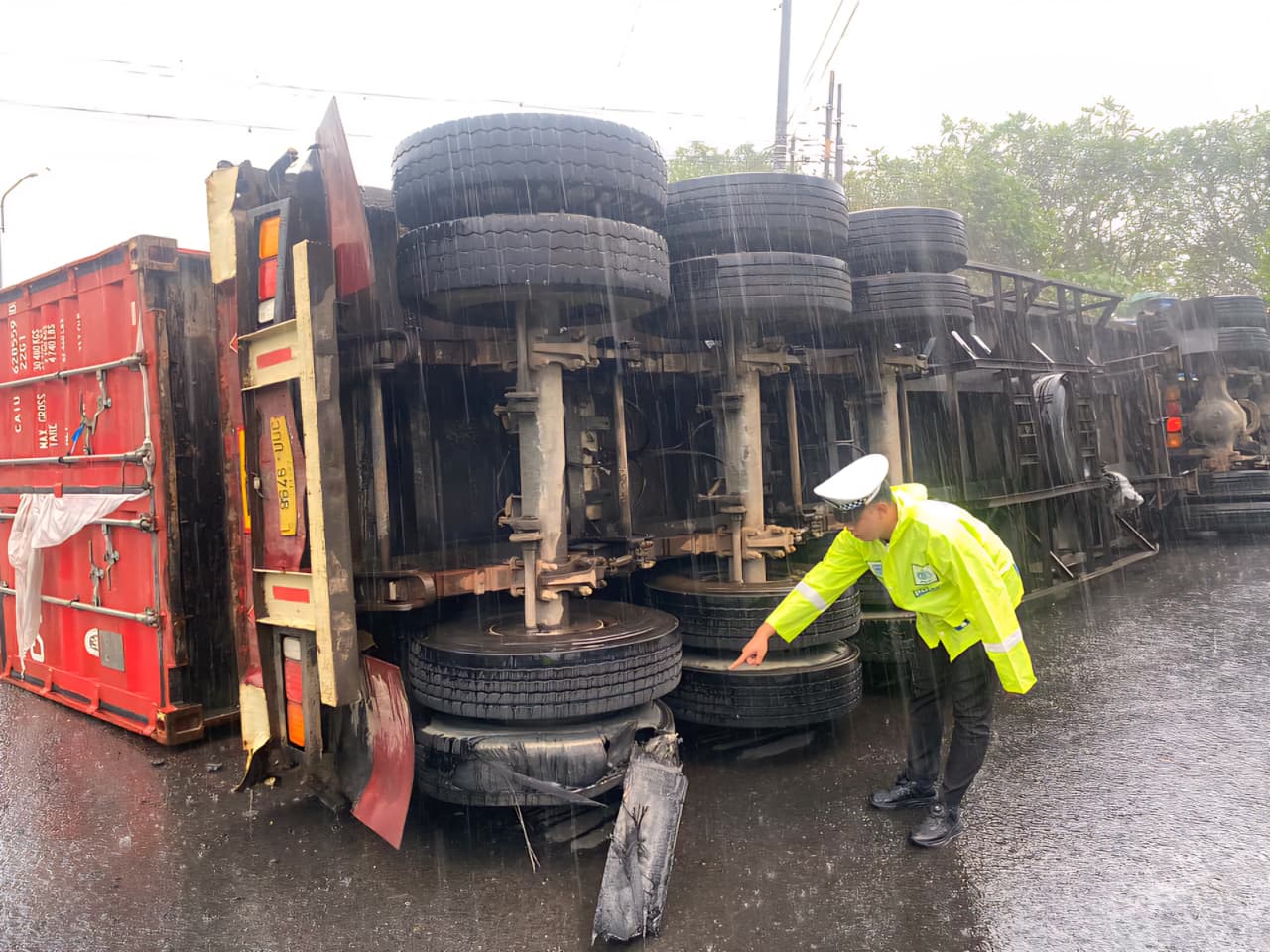 Muatan berupa dua peti kemas berisi jagung mentah sempat berserakan di sekitar lokasi kejadian, sehingga proses evakuasi memerlukan waktu dan pengaturan arus lalu lintas secara intensif.